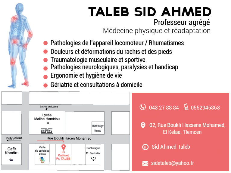 Découvrez les médecins spécialistes en réeducation et réadaptation fonctionnelle exerçant dans la wilaya de Wilaya de Tlemcen. Accédez aux coordonnées, adresses et informations essentielles pour prendre rendez-vous rapidement avec un professionnel de santé en Algérie.